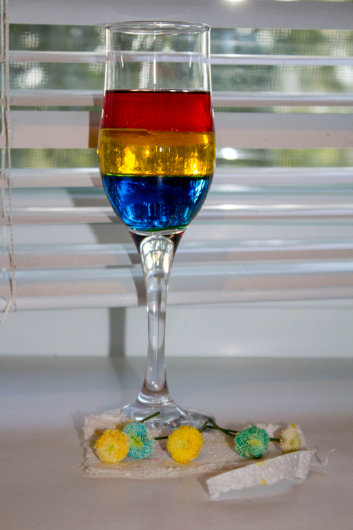 Перед этим пробовали сделать похожий опыт, только вода должна была отличаться по плотности из-за разного количества добавленного сахара, но он не получился. Внизу остался только синий цвет, остальные перемешались.