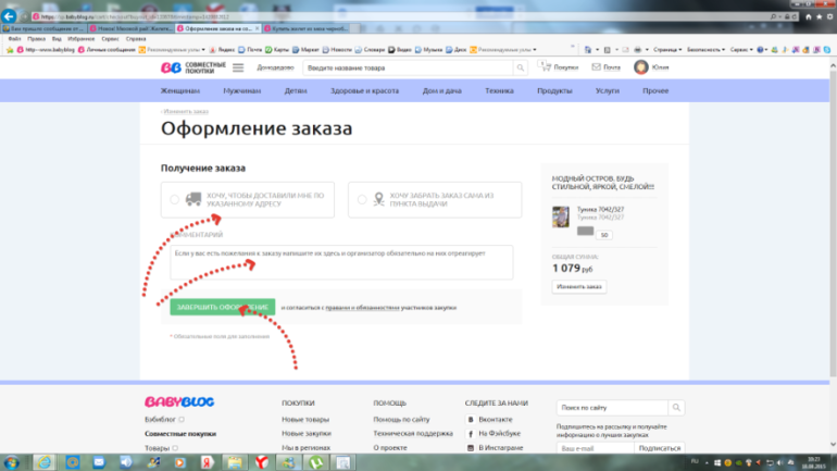 4. Далее открывается форма в которой Вы выбираете способ доставки, можете оставить комментарий к закупке (например, указать цветовые предпочтения, написать замены по товарам и задать любые интересующие Вас вопросы).