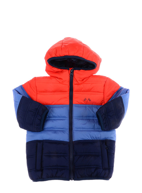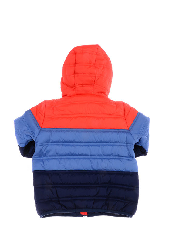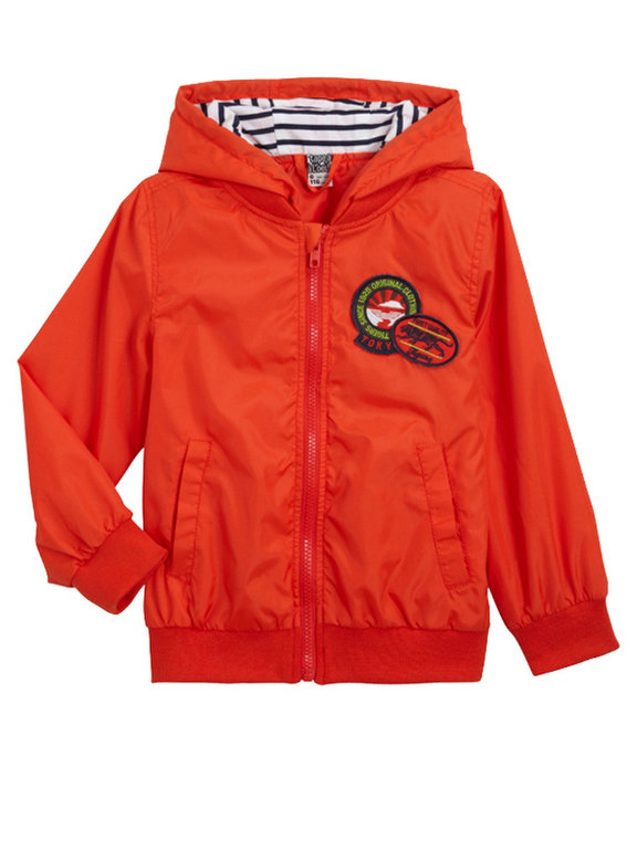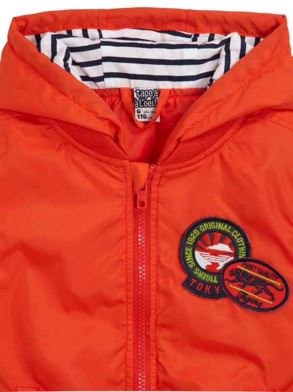 Куртка-ветровка без утепления фирмы t-a-o (Tape à l'oeil) Франция. Ярко-оранжевая, ткань плащевка + подкладка без утепления. Застежка молния, 2 кармана, трикотажные манжеты на рукавах, на груди эмблемы, капюшон внутри с полосатой трикотажной подкладкой. Состав 100% полиэстер. Размер 18мес (86) и 2-3г (96) 790руб