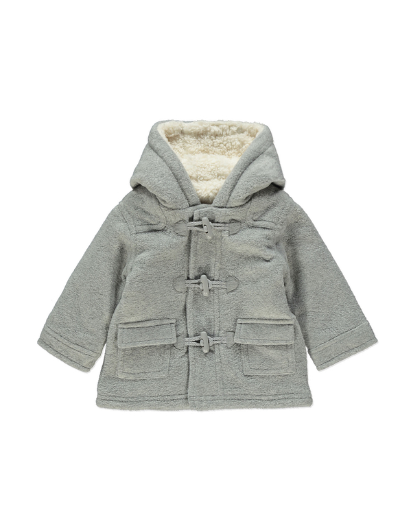 Пальто даффлкот с капюшоном на мягенькой меховой подкладке фирмы George. Сезон прохладная весна-осень, это как толстая-толстая кофта. Верх - ткань типа флиса с ворсом, внутри куртки и капюшоне мягенький мех, внутри рукавов подкладочная ткань. Серый, накладные карманы, застежка-липучки + пуговицы. Состав полиэстер. Размер 12-18месмес (80-86), 18-24мес (86-92) 990руб