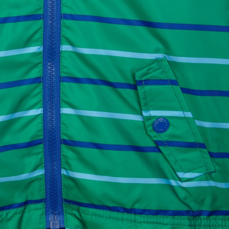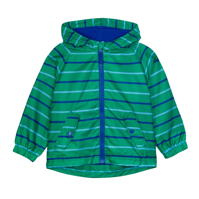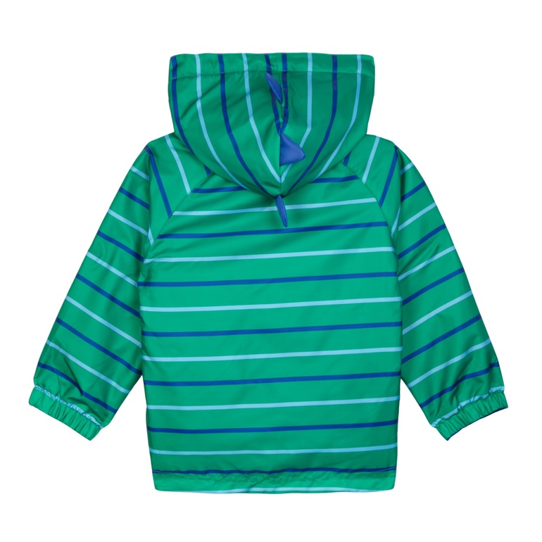 Куртка -ветровка с капюшоном на флисовой подкладке. Верх - болоневая ткань, внутри куртки и в капюшоне флис , внутри рукавов подкладочная ткань. Ярко-зеленая, синие, голубые полоски, застежка-молния, 2 кармана на кнопках по бокам. Сверху на капюшоне шипы, как у динозавра. Состав полиэстер. Размер 18-24мес (86-92) 1100руб