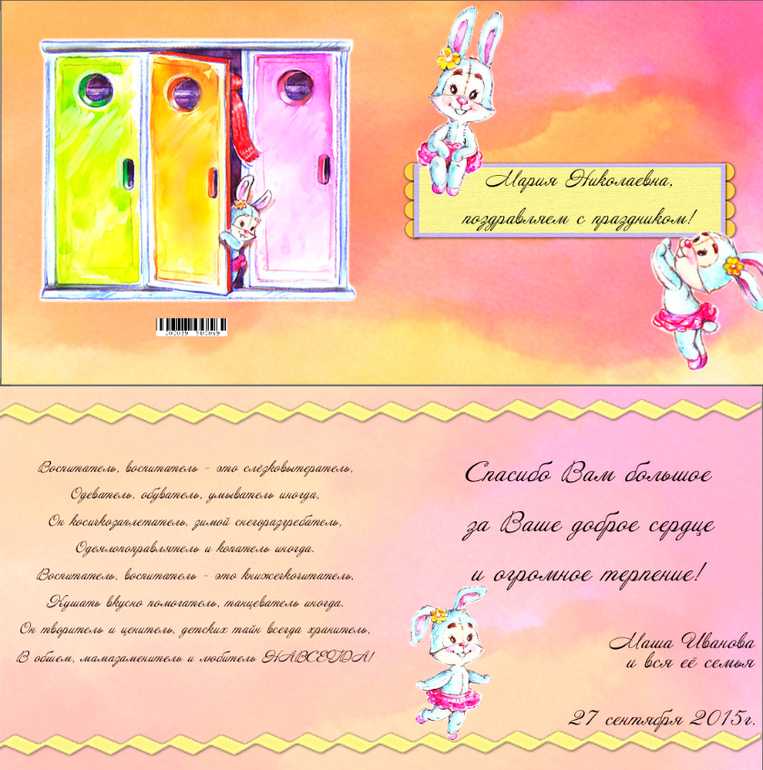 Вот такие именные открыточки сделала нашим воспитателям и нянечке. Они у нас замечательные - любят Машу как родную и терпят все ее выходки. Поэтому от нашей семьи будут такие открыточки и небольшие подарочки, надеюсь, им понравится))