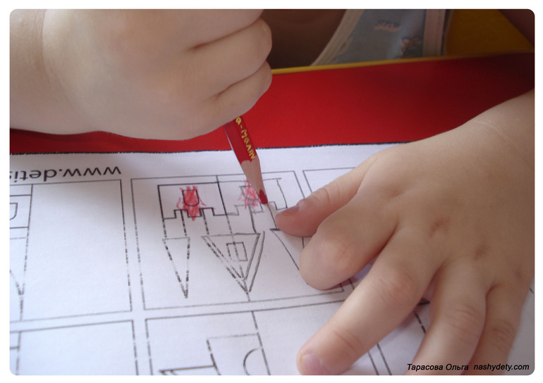 На фото видно, что ребенку повторять узор было не то чтобы не интересно, а скорее не понятно и сложно. Он принялся раскрашивать картинку, для него это привычное действие из предыдущего опыта игр.