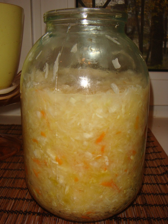 * где-то на 4й день капуста будет готова, если вы протыкаете капусту а пузырьков уже нет, значит все ок. Закрывайте банку крышкой и убирайте в холодильник.