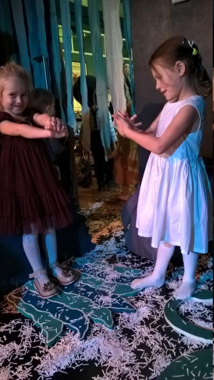 Ну а после мероприятия детям позволили разгромить сцену) Алеша развивал моторику посредством мишуры, которой была украшена сцена) А Агата играла с девочками в лебедей.
