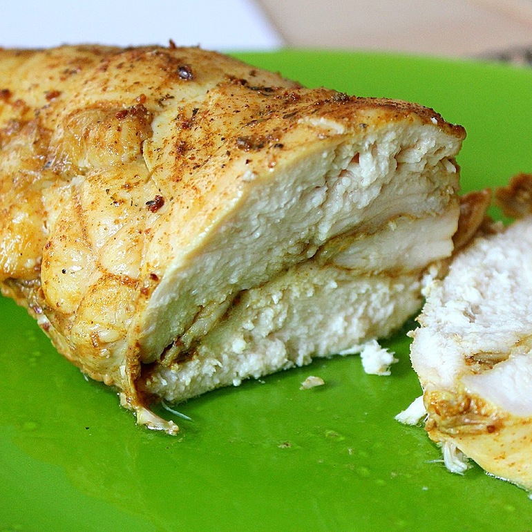 на ночь 2 грудинки замочила в молоке. Утром, слив молоко, замариновала на час в специях: куркума, карри, паприка, специя для курицы, оливковое масло, соль, коричневый сахар, мускатный орех. Через час достала из холодильника, соединила грудки вместе и перевязала их обычной белой нитью. Сверху добавила куриной приправы. На противень постелила фольгу, положила курочку и в заранее разогретую духовку на 20 минут при 220 градусов. Плюс ещё 5 минут вконец при 150 подержала и достала. Запах, вид, вкус фантастика. Попробуйте, это легко! Вся фишка в молоке, оно делает курочку сочной, нежной и мягкой. А специи выбирайте и добавляйте по своему вкусу для маринада.