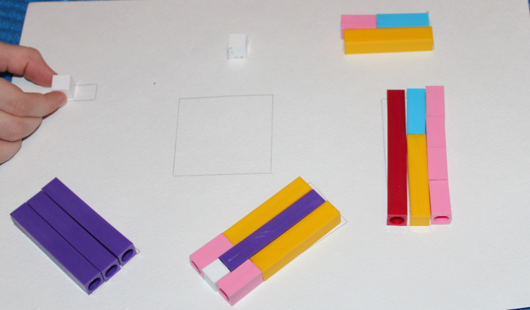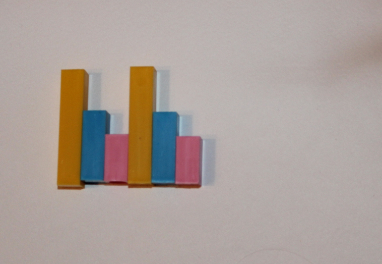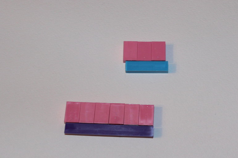 3. Знакомимся с частью/целым. Т.е. смотрим сколько коротеньких палочек умещается на длинной, выкладываем из коротких длинную - того же размера и тп.
