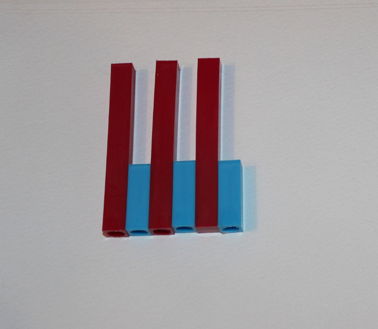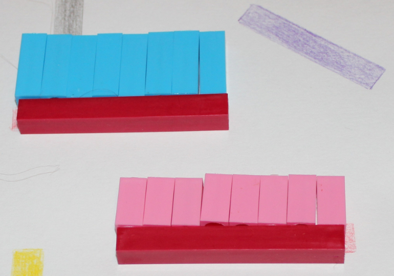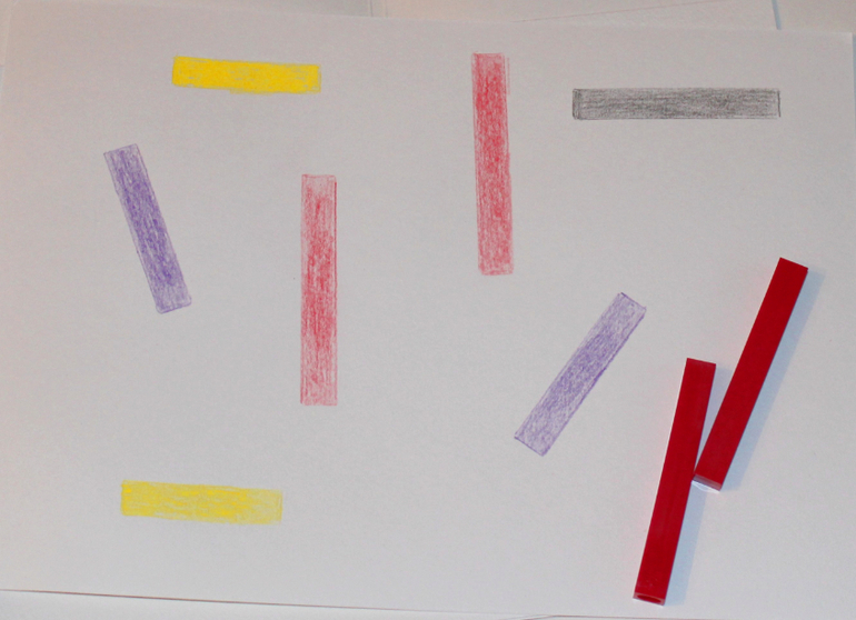 Выбор цвета преследует цель облегчить использование комплекта. Палочки 2,4,8 образуют «красную семью», 3,6,9 - «синюю семью». «Семейство желтых» составляют 5 и 10. Подбор палочек в одно семейство (класс) происходит не случайно, а связан с определенным соотношением их по величине. Например, в семейство красных входят числа кратные двум и т.д. В каждом из наборов действует правило: чем больше длина палочки, тем больше значение того числа, которое она выражает.