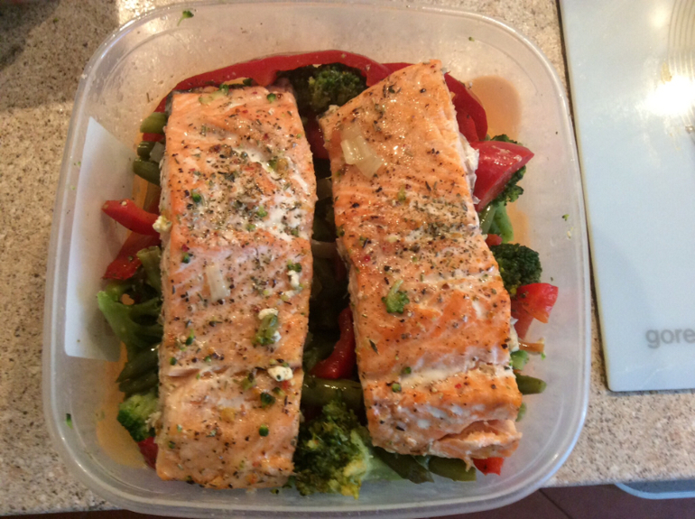 Приправить их солью и специями. На овощи положить семгу. И отправить в духовку разогретую до 180 гр на 30-35 минут, потом перемешать овощи и оставить еще на 7-10 минут при температуре 200 гр. и все блюдо готово.