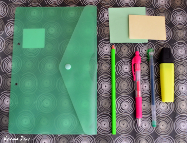Очень удобно, в небольшой конверт сложить заранее стикеры для записей, ручку, карандаш и маркеры. В нем, нужно дыроколом сделать дырочки, чтобы поместить в органайзер, сверху всех документов.