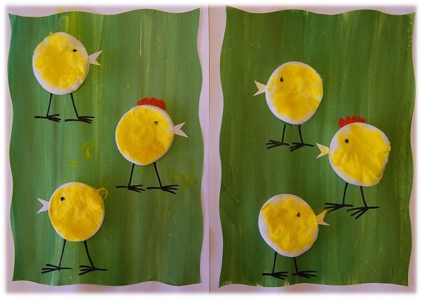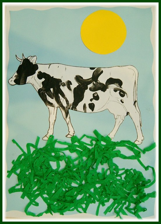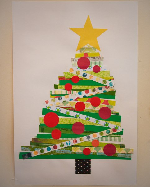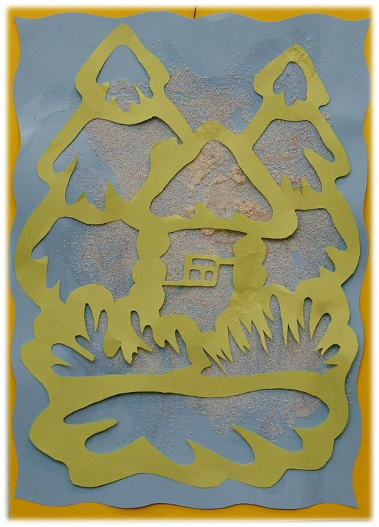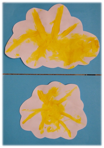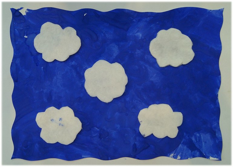 Тут мы в центре наклеивали на лоскутную тучку ватный диск и вместе красили его. (Образец не наш.)