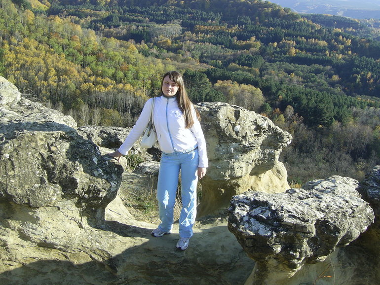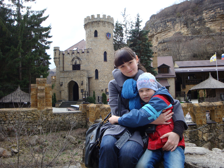 Добраться до замка можно на обычной городской маршрутке (а экскурсоводы дерут с туристов намного дороже!), с остановки еще идти минут 20 по живописной местности. На заднем плане след. фото видны скалы, похожие на слоеный пирог. Оказывается, что в этой местности много млн.лет назад был океан, и мы ка раз шли по его дну. Давида этот момент очень впечатлил))