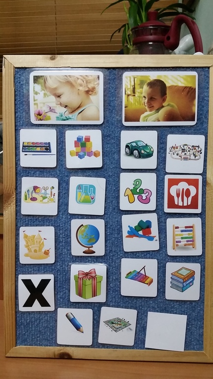 Для каждого пункта из списка подобрала подходящую картинку-иконку. Сделала карточки, распечатала, заламинировала, приклеила липучки (карточки крепим на фланелеграф). Получилось так