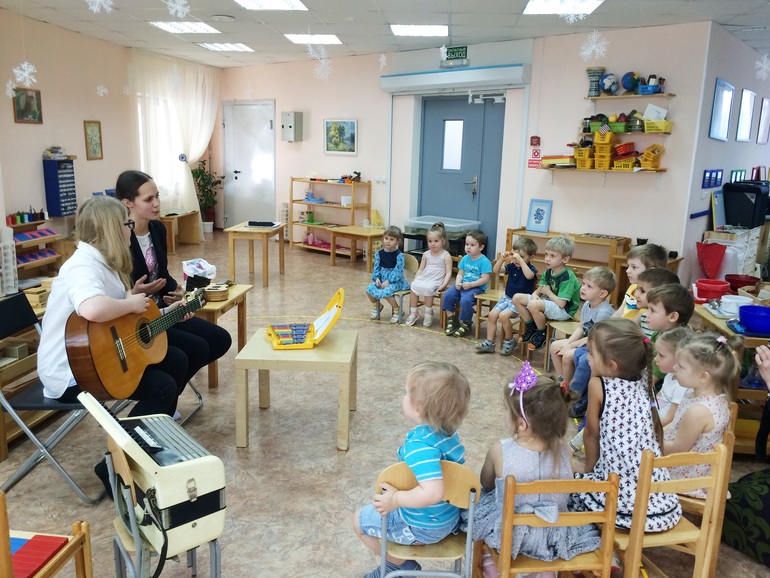Вчера состоялась первая встреча. Были приглашены две девочки школьницы с аккардеоном, гитарой, гавайской мини гитарой, металофоном и флейтой.