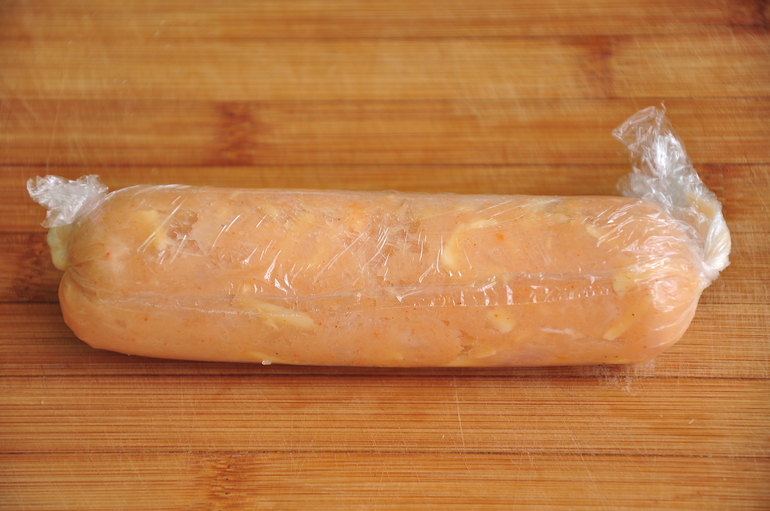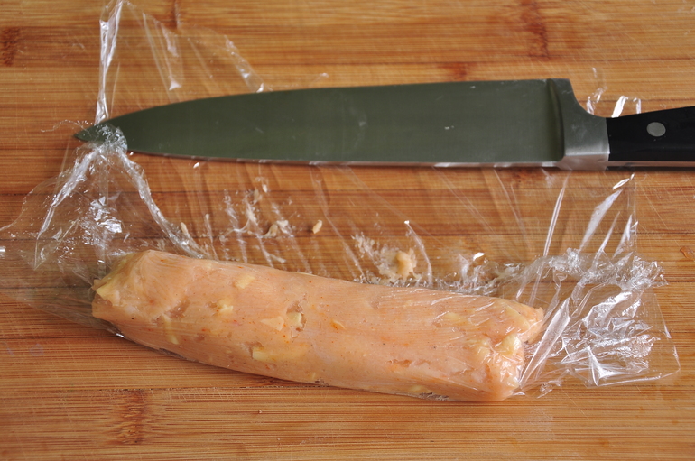 Немного утрамбовать фарш и завернуть, пленку отрезать.