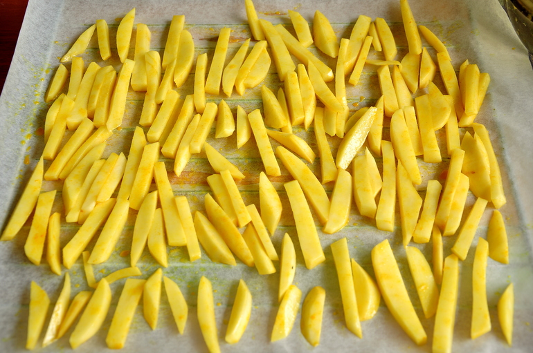 Сбрызнуть картофель оливковым маслом, добавить соль и куркуму (на глаз) для цвета.