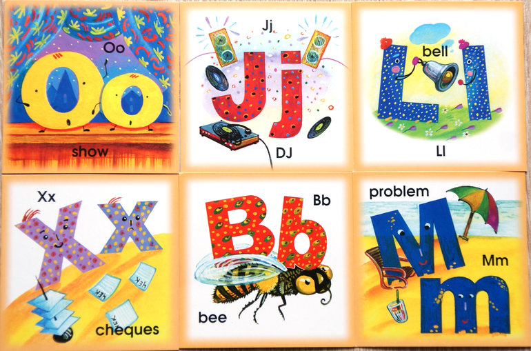 Вот карточки с буквами алфавита и словами созвучными с этими буквами.