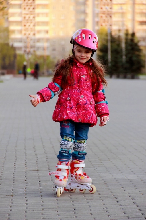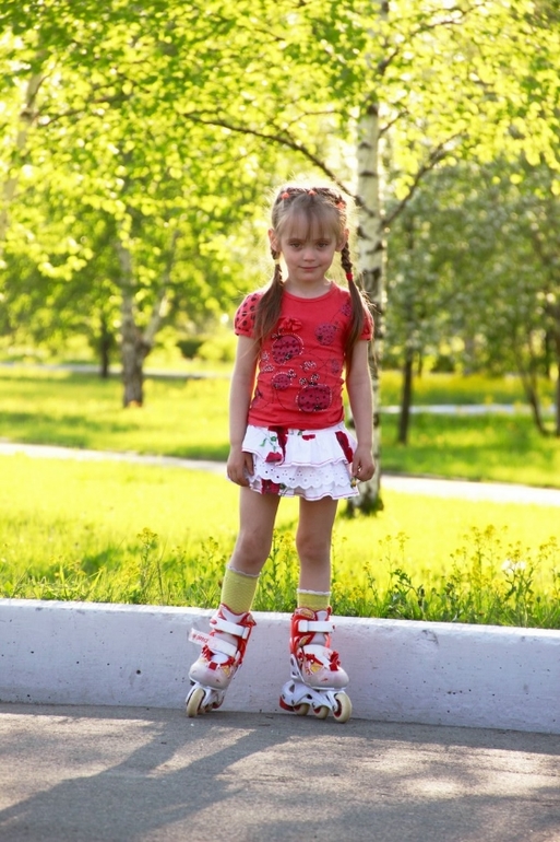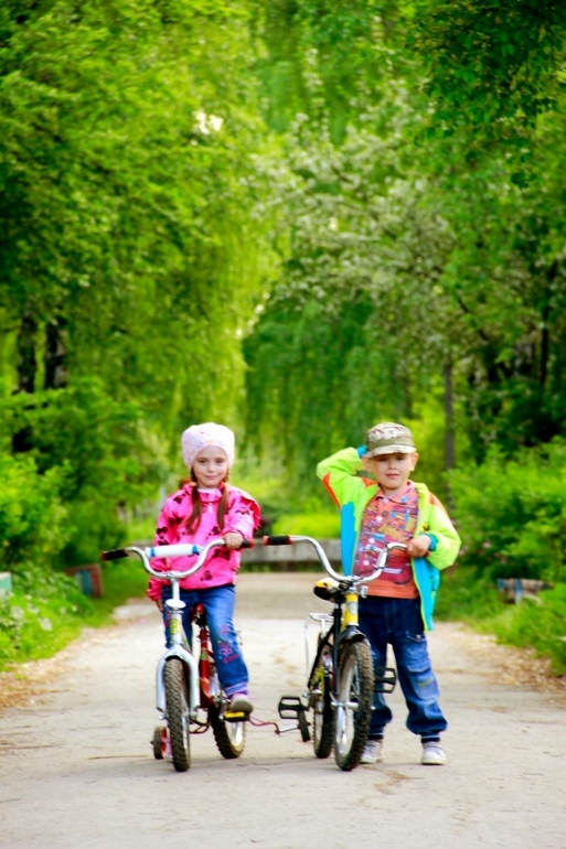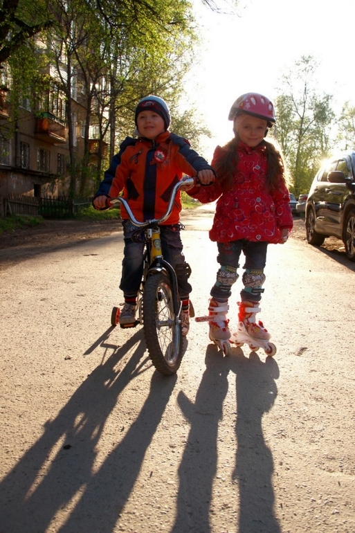 Начали с Игорька, он лучше доставал педали, а Лёльке одели ролики, в итоге обкатывания в течение двух недель в мае (май удался теплый, я даже хорошо загорела к лету)