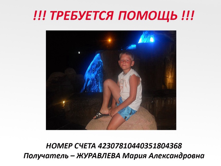 Сильно пострадал 11-летний мальчик Захаров Юра, ученик 4 класса школы №2. Ребенок находится в Московской клинике в тяжелом состоянии. В данный момент сосудистые хирурги пытаются спасти ногу мальчика. Впереди ждет тяжелое лечение, операции и долгий период реабилитации. Требуется материальная помощь. Юра активно занимался греблей, имел спортивный разряд. Добрый и жизнерадостный ребенок! Ниже указаны банковские реквизиты мамы Юры: