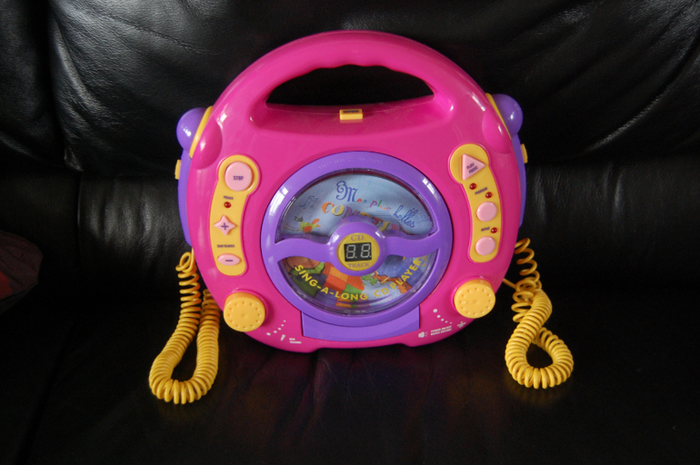 1. Вот этот розовенький (голубого просто не было уже в продаже) магнитофончик с двумя микрофонами - просто отпадная вещь. Вставляем диск, включаем музыку и поем все вместе в микрофоны. Мы, вот честно, каждый раз так веселимся!