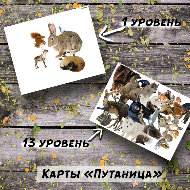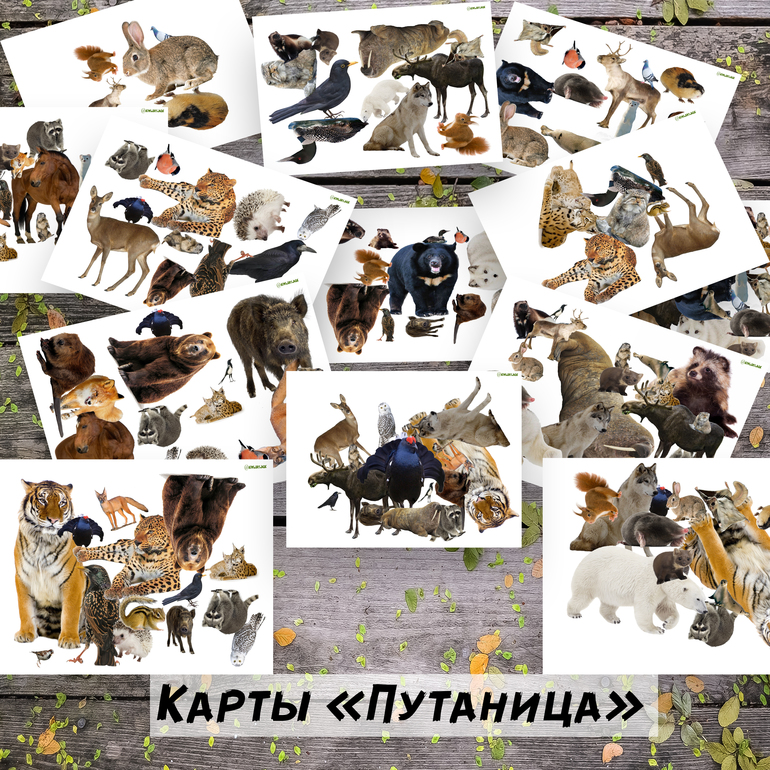 - Каждый игрок по очереди открывает большую карту "путаница" и нужно как можно скорее найти у себя животных, изображенных на ней и сбросить эти карты на стол