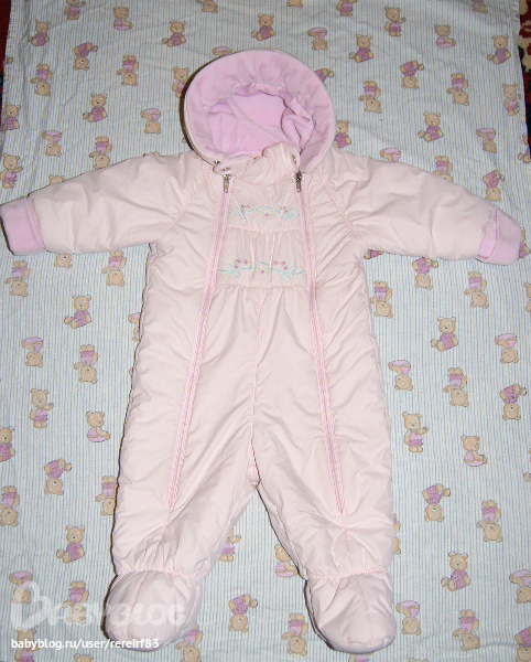 Осенний,очень симпатичный комбез,нежно розового цвета.Ручки закрываются,на ножках пришитые пинетки.Две молнии,на груди вышивка.Размер 68-74