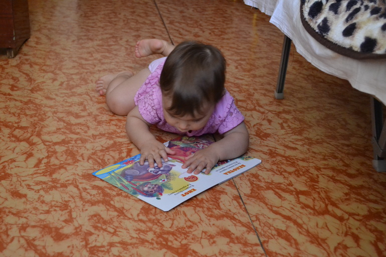 Игрушки только приносит ,если её попросить ,или сидеть с ней играться. В большом уважении - книги. Носит их по всей квартире и требует ,чтоб я ей что-то в них показывала и переворачивала страницы.