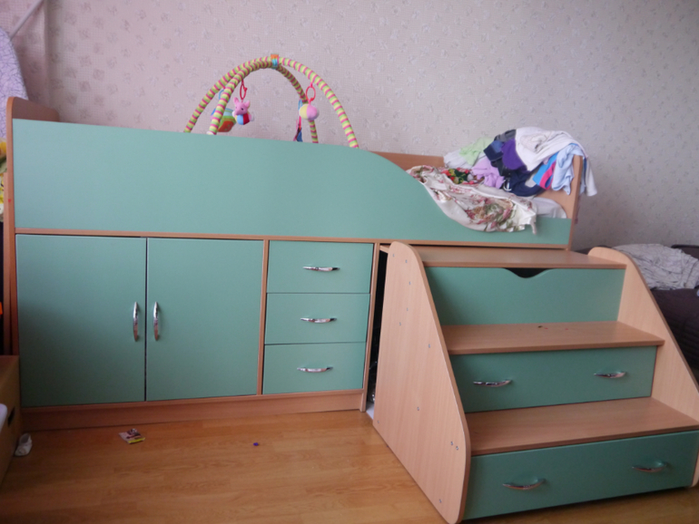 Кровать полностью заменила комод, шкаф. Дочке там интересно. Лестница выдвигается, там много пространства, она там играет, делает домик. Поверх лестницы стол, где мы рисуем или собираем пазл. Спального места хватит до свадьбы:) Минус есть, под моим весом (60 кг) слышен хруст.