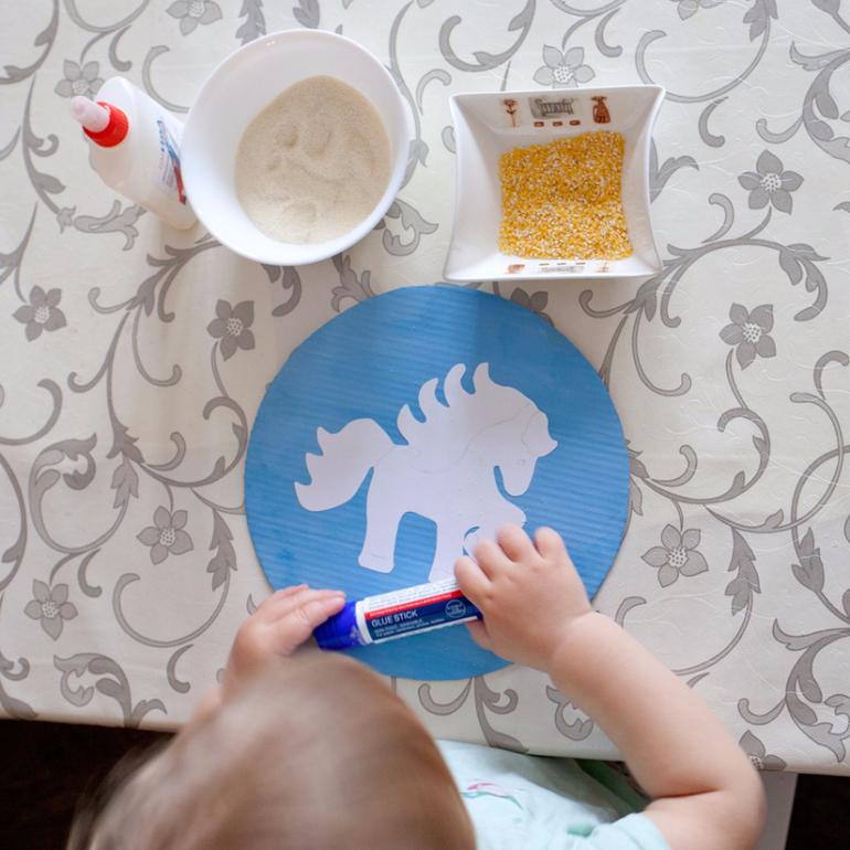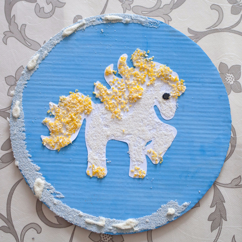 Для данной аппликации я подготовила картонный круг, покрасила его в голубю гуашь и наклеила белую лошадку с контурами. Выдала маше манную крупу и кукурузную, мазала по границам клей, а она сыпала крупу. Кукурузную можно еще в блендере размолоть, чтоб клеилась получше.