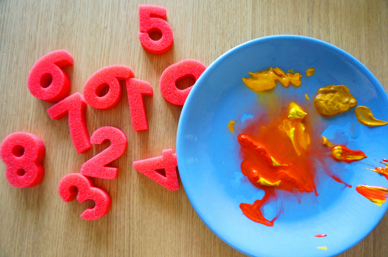 Недавно купила набор поролоновых штампиков в виде цифр. Чем не занятие по рисованию, счету и веселью? Я часто упоминаю о том, что для маленьких деток цифры, как картинки, ничего не таят за собой, если нет рядом точек или палочек, поэтому я в процессе рисовала для Маши нужное количество точек, дорисовывала глазки, лица, оживляла героев а из некоторых цифр у нас даже получились цветы! Весело и ненавязчиво привыкаем к миру цифр!
