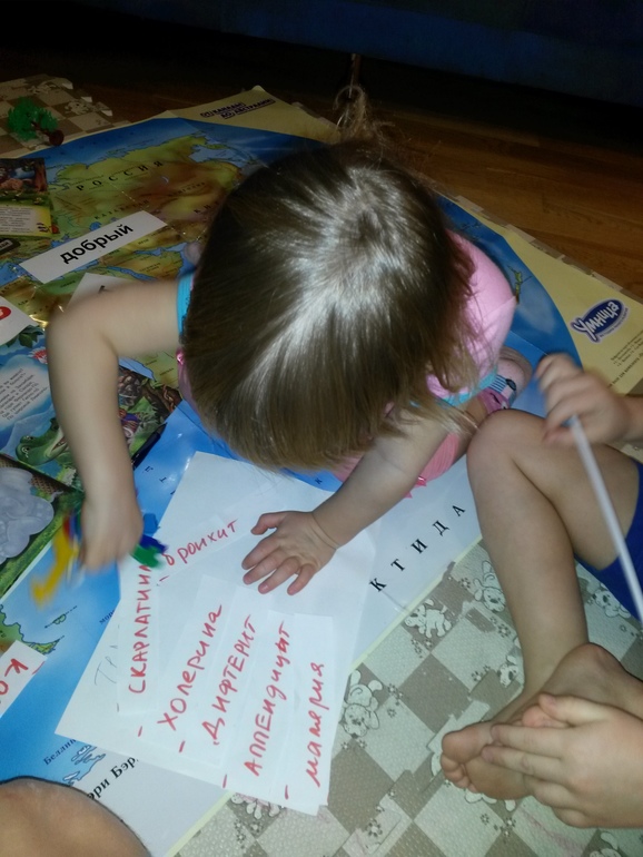 инсценировка Доброго Доктора Айболита! Попалась книжка с наклейками очень кстати в магазине. Айболит у нас живет в России. Коля начал писать, поэтому Настя ему говорила, какую букву надо написать, чтоб превратить слово Ножка в Ножки:)и так они превращали далее все слова, которые нужно было преобразовать. Писали телеграмму, знакомясь с новыми словами-болезнями. Решили они, что у Айболита обязательно должна быть машина, почему-то пожарная:) Вобщем, даже в сказку играли 2 дня:)