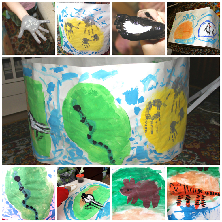 + с каждого члена семьи по ладошке для создания слонов (папа, мама, Варя и Катюшка) + две "пингвинячьих лапки" - Варина и Катюшина.