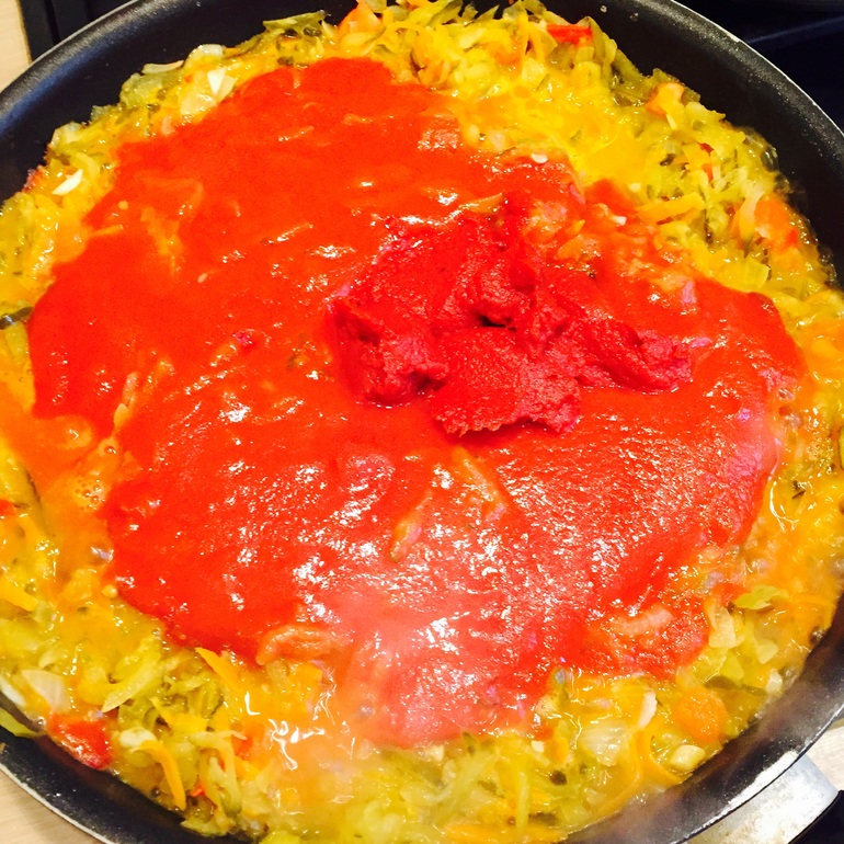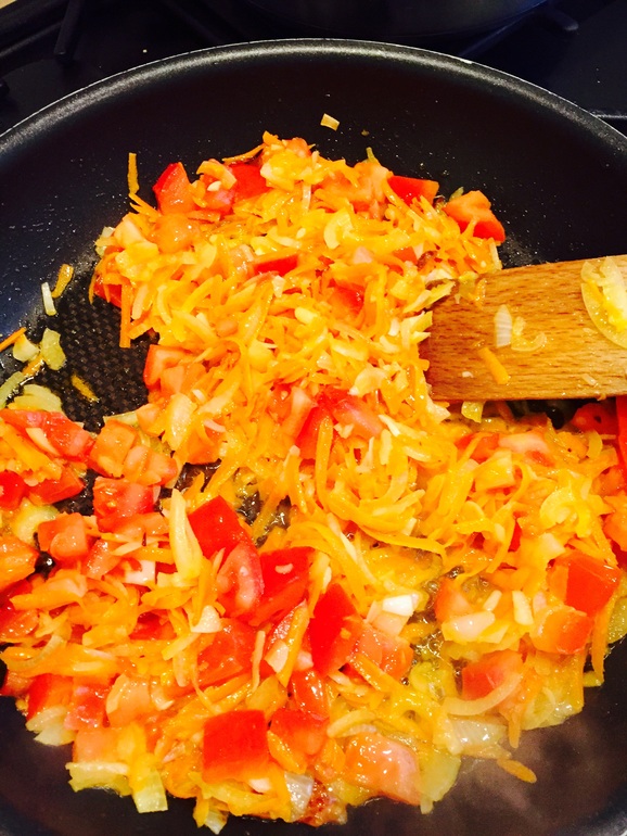 Морковину потерли на терке, пару луковиц тонко нашинковали, пару помидоров кусочками. Жарим на оливковом масле. Ченок конечно туда же.