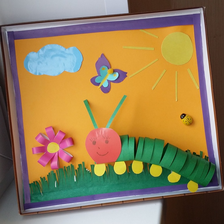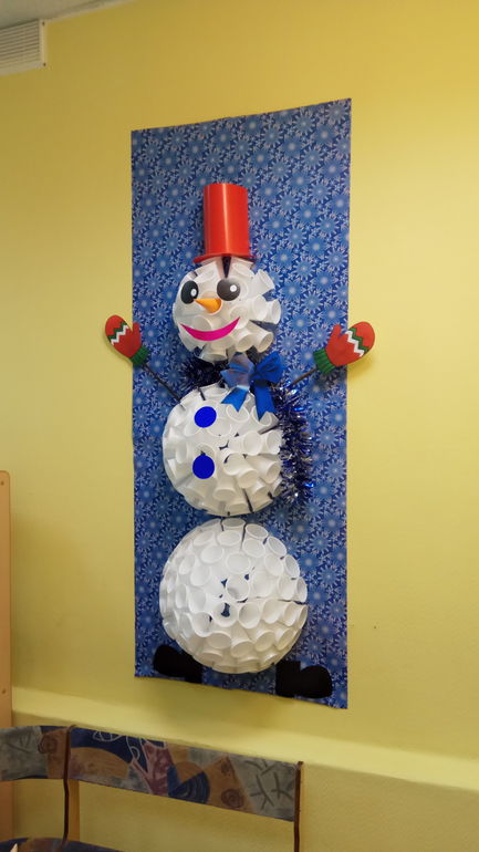 У нас получилось две елочки из пластиковых стаканчиков и зимний домик со снеговичками на лыжах!