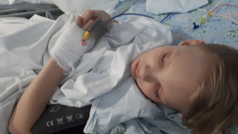 Встретились мы у больницы, пошли в реанимацию. Я прошла, принесла Степе фигурку черепашки - он был очень рад. Лежит крючком и прямо ложиться отказывается. И поправить себя не дает.