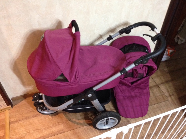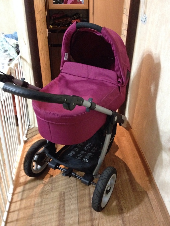 Комплектация - шасси с колесами 60А( надувными) и ручным тормозом, люлька с матрасиком, москитной сеткой и дождевиком, прогулочный блок с 5-точечными ремнями безопасности, бампером и накидкой на ножки, дождевик на прогулку, москитка. Также есть муфта на зимнее время, мини-нест( конверт), сумка для мамы( с пеленальным матрасиком и термосом для бутылочки). Коляска очень удобно складывается, шасси входит в багажник. ВАЖНО - и люльку и прогблок можно установить как по ходу движения, так и против ( в отличии от Peg Perego GT3). Коляска в отличном состоянии. Цена 18000 рублей