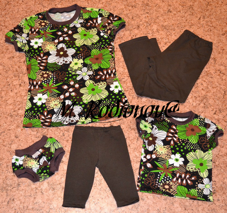 Костюмы состоят из футболок и укороченных по голень лосин. Сшиты в коричнево-салатовой гамме из х/б кулирки (футболки) и кулирки с лайкрой (лосины). Больше фото под катом.