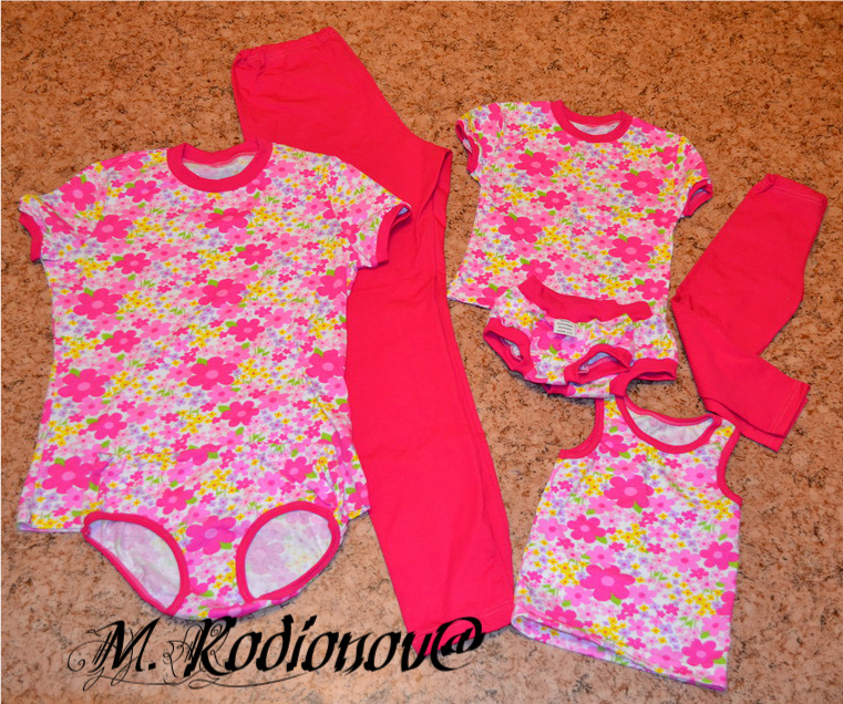 Костюм для мамы состоит из футболки, трусов и длинных лосин. В костюм для дочки входит - футболка, майка, трусы-хипстеры и длинные лосины. Сшиты в розово-малиновой гамме из х/б кулирки и кулирки с лайкрой (лосины). Больше фото под катом.