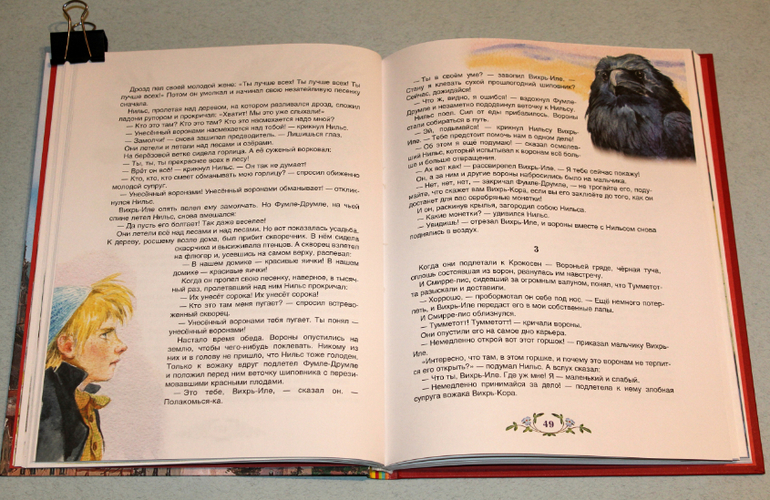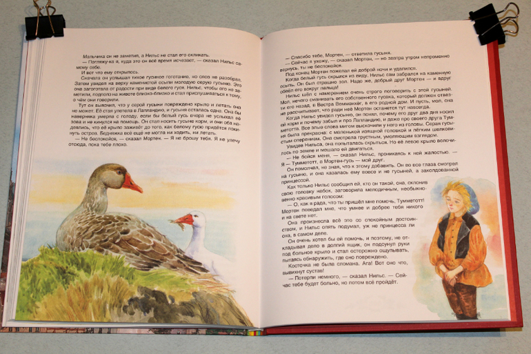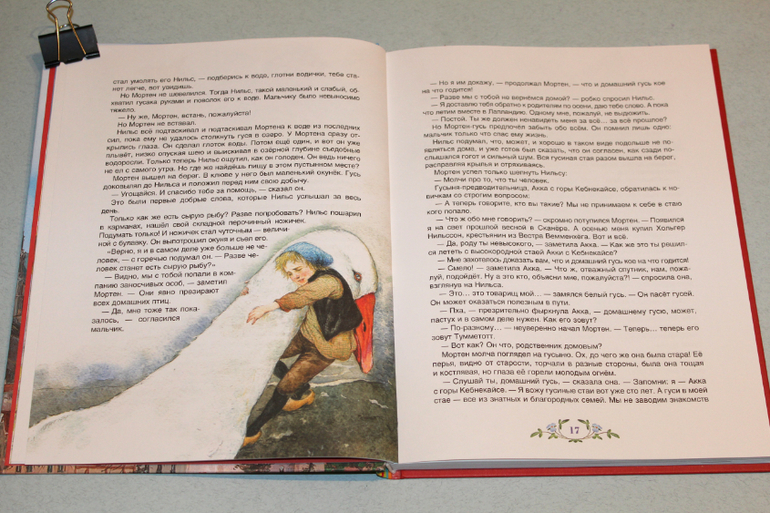 Аннотация из интернета: Герой этой замечательной сказки мальчик Нильс, однажды превращенный в крохотного человечка, совершает удивительное путешествие по родной стране вместе со стаей диких гусей. Увлекательные приключения и трудные испытания учат Нильса быть честным и смелым, а верные друзья всегда приходят ему на помощь.