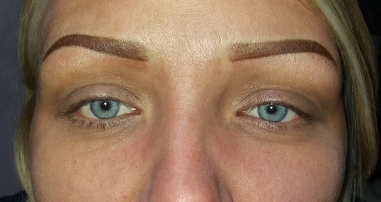 Мдааа уж...мне тоже было боязно браться за эту работу! У девушки от природы нет своих бровей. На фото видно остаток старого татуажа..мне предстояло перекрыть и создать новую форму бровей. На коррекции еще доработаем.
