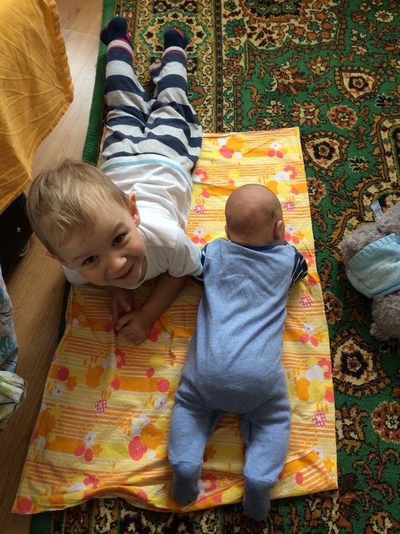 и конечно старшему надо участвовать во всех делах малыша) учимся держать голову... коллективно...