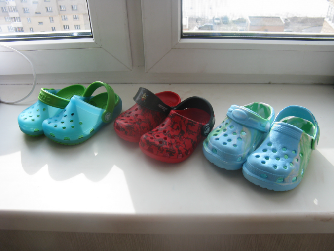 очен удобная обув для детей,ест еще с мехом внутри ,зимой в детсад ходит удобно,у нас очен дешево,вообще на рубли 150 рублей, и всякие с украшениями(дети сами могут приделат,специалные)