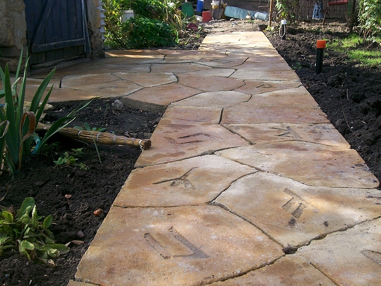 Так как мне хотелось, чтобы на моей дорожки были руны, то железнение приходилось делать два раза. Первый раз я заглаживала мастерком, затем слегка вбивала выпиленные заранее трафареты рун (с ввинченными в них большими саморезами, чтобы можно было легко их достать), а уже затем просто посыпала через сито той же смесью (цемент+краситель).