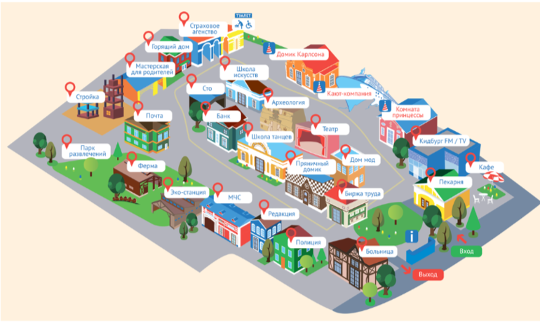 Театр, МЧС, ферма, мульт-студия. На каждую профессию 20-30мин, плюс ожидание в очереди.