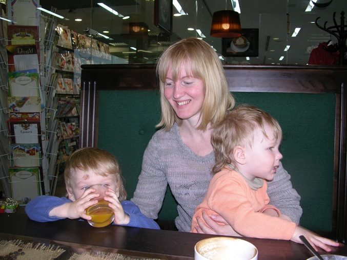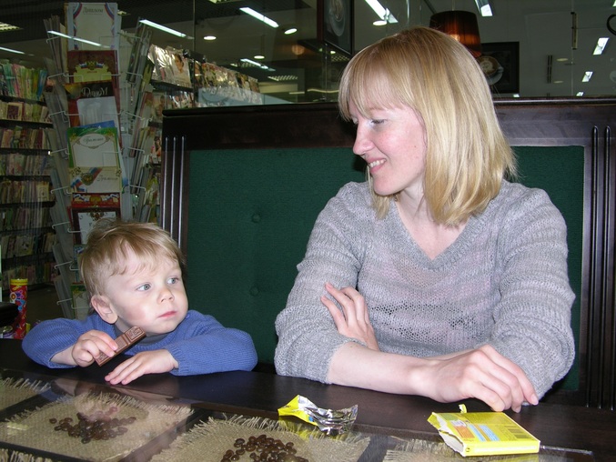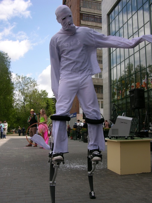 Потом Максим лихо отплясывал под детские песенки. А Сёма созерцал с жутко серьезным видом (обычное для него дело ). Потом рисовали на асфальте. А потом Максима завалила девочка - дообнимался. Теперь девочек недолюбливает уважает. А затем мы пришли в кафе. Максим опять свалился - теперь уже со стула под стол. Сёма наделал в штаны. В общем, было весело! Да, еще нам досталось по бесплатной порции мороженого, правда, мальчишки не оценили. На них напала трясучка от шоколадок "Несквик", целую кучу которых нам надарила организация, где я работаю. А под конец на улице к нам подскчил фрик чудесный белый клоун на ходулях...