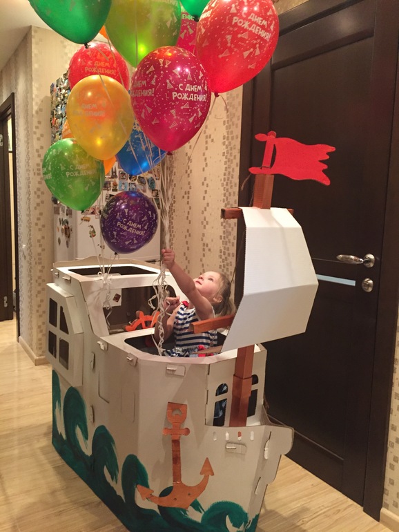 Хит нашего ДР корабль Картонный папа! В коробке были заготовки. Собирали и раскрашивали сами! Места занимает много, но он просто супер!!!