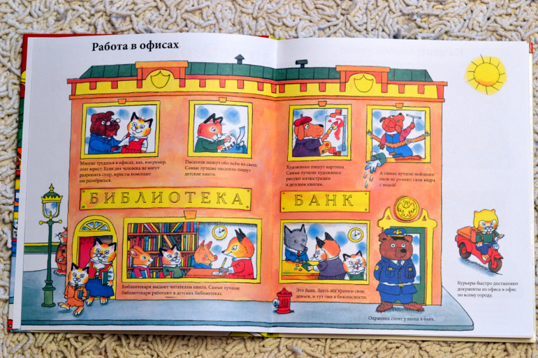 С утра до вечера в Городе Добрых ДелПознавательная книга для детей. Сложно словами рассказать малышу что откуда берется, что из чего сделано, книга наглядно все рассказывает и показывает. Она практически вся состоит из картинок, много мелких деталей сложно подолгу разглядывать. Моя дочь 2-х лет с открытым ртом смотрела как делается стул,для нас, взрослых, данные вещи кажутся простыми, подумаешь деревянный стул, а здесь показана вся технология от сруба дерева и до готового изделия, причем все в доступной для детей форме.