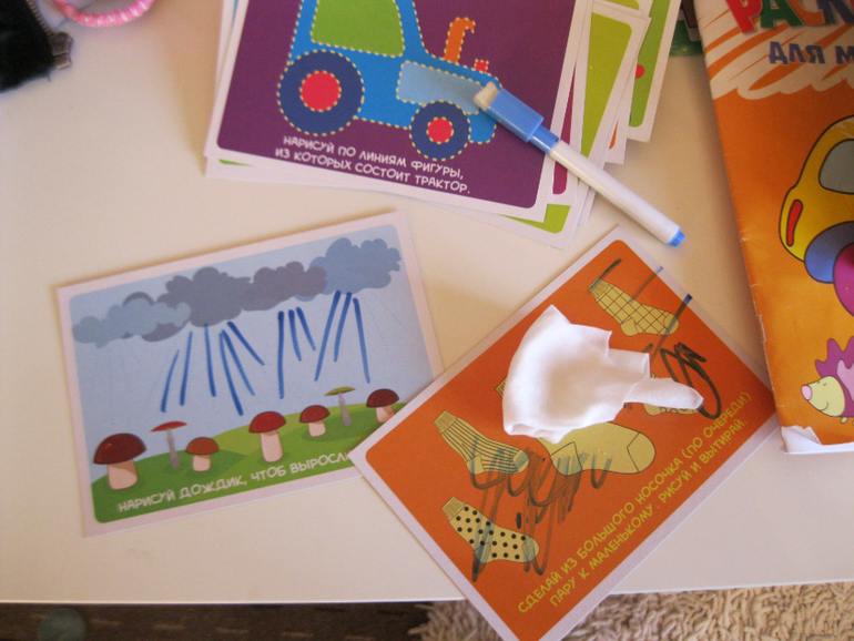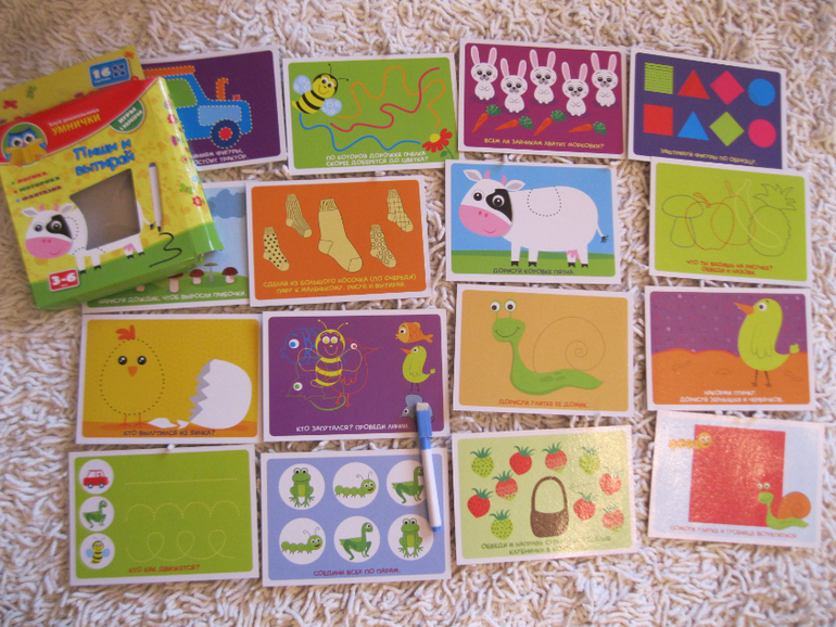 Настольная игра "Пиши и вытирай. Корова"Супер развивашка от 2 лет! Не дорогая, но очень классная! Набор содержит 16 карточек с заданиями и маркер со стеркой. Карточки для многоразового использования, задания простые и понятные(например нарисуй дождик, соедини по парам и т.д.), есть попроще, есть посложнее. Все идеально стирается влажной тряпочкой или салфеткой или стеркой что есть в комплекте.