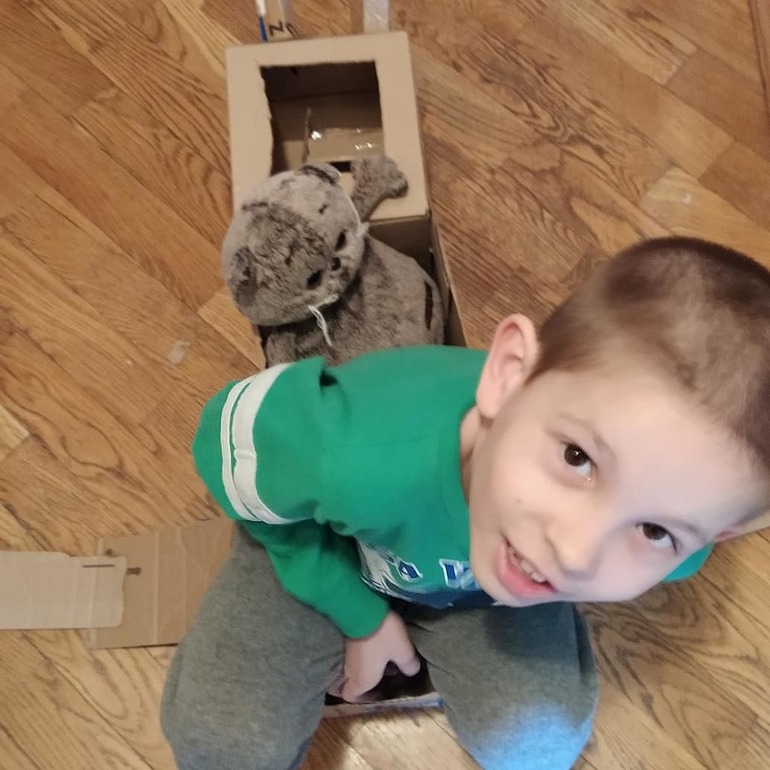 Коробки склеены клеевым пистолетом и местами скотчем. По-моему получилось здорово. За то время как старший делал корабль, дочка рисовала по видеоуроку и даже не хотела прерывать это занятие. Ей очень понравилось так рисовать. Малыш тоже порисовал, но надолго его не хватило. Включила ему урок в библиотеке.