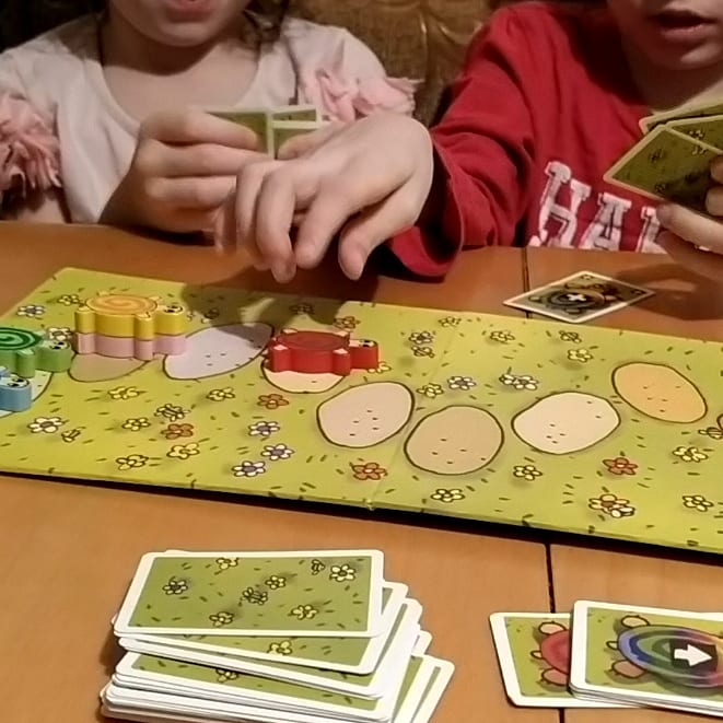 Каждый игрок перед началом игры вслепую выбирает себе одну из пяти черепашек. И берет на руки 5 карточек, которые позволяют черепашкам двигаться. Особенность игры заключается ещё и в том, что ваша черепашка может кататься на спине у своих товарищей. Игроки ходят по очереди, стараясь чтоб именно его черепаха дошла первой до капустного поля (последнего деления дорожки). Играя с младшим нашим участником, мы упростили правила и придумали свои хоумрулы. Вслепую мы черепашек не выберем, а болеем за понравившуюся на данный момент черепашку. Очень нравится нашему младшему синяя черепашка. Карточки не раздаем, а вытягиваем по очереди из общей колоды. Конечно когда попадается карточка радужной черепашки игрок старается помогать именно своей черепашке.